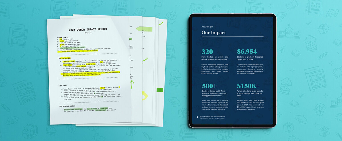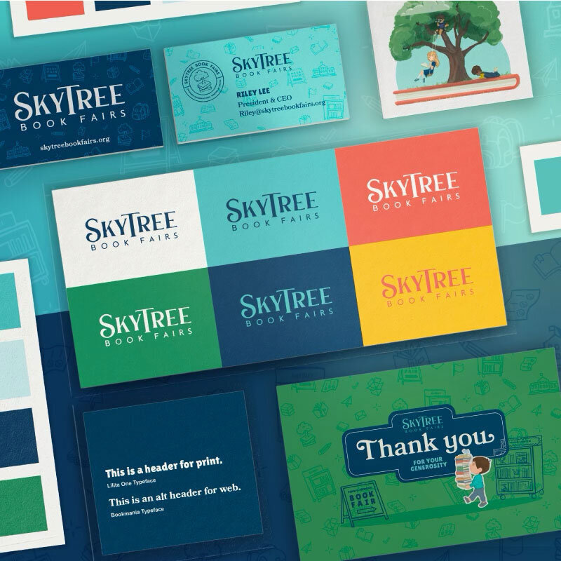 Served for two years as lead designer, marketing partner, and brand strategist with national nonprofit, SkyTree Book Fairs. Delivered an end-to-end brand build that powered their $1.2M first-year campaign.